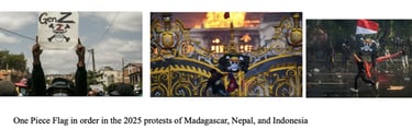 In recent protests across all continents of the world, the One Piece Jolly Roger flag has emerged as a tool of culture jamming. When demonstrators wave this flag, they are not simply referencing an anime or trying to glorify piracy in any way. They are invoking the flag’s meanings of freedom, resistance, and unity against oppressive systems which they are actively protesting against. Within the framework of culture jamming, the flag becomes an act of subversion. The flag transforms a piece of global pop culture into a universal language of dissent. In Nepal, demonstrations began after the government imposed a ban on social media platforms. This quickly grew into a movement against corruption and political elitism, which eventually forced the prime minister to resign. In Indonesia, citizens took to the streets to protest against a bill proposed to increase parliamentarians’ housing allowances amidst the country’s high economic inequality. Meanwhile, in Madagascar, protests began in response to water and electricity shortages. These soon evolved into demands for accountability and leadership reform, which led to the president fleeing the country. The Straw Hat Pirates’ struggle against the World Government mirrors the protestors’ struggles against corruption, inequality, and authoritarian control, allowing the flag to bridge fictional rebellion and real-world protest. Additionally, it signals unity among young people inspired by Luffy’s dream to live in a world where everyone can live freely.